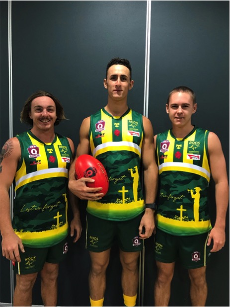 This week is the big annual ANZAC Noosa clash at home which no doubt will be a tough challenge with several key Roos players still out with injuries. For the first time we unveil a special ANZAC jersey for the Senior men to wear on Saturday as part of our tribute to the ANZAC spirit. Pictured are L to R: Jake Warren, Lochie Laing and Jackson Bury. Ceremony starts at 2pm with game commencement 2.15pm.